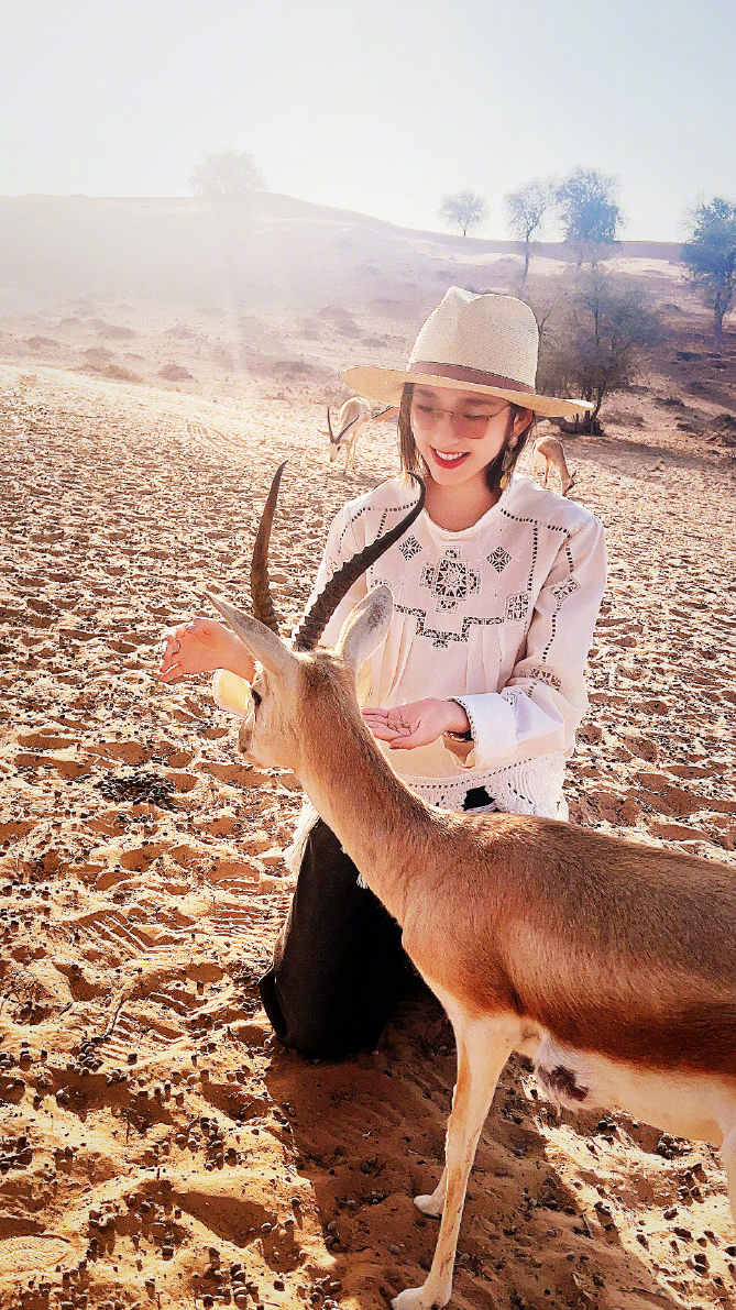 镜头里,唐艺昕蹲下身,微笑着低头抚摸着小鹿的角,穿着简洁的白色上衣和黑色裤子,头戴一顶休闲的草帽,整个人看起来自然又温柔。这一幕展现了她温暖的气质,她的每一个表情和动作,无不透露出她对生活的温柔与感恩。即使是情人节,她也选择在这片广袤的沙漠中与自然亲密接触,找寻一种内心的充实与放松。