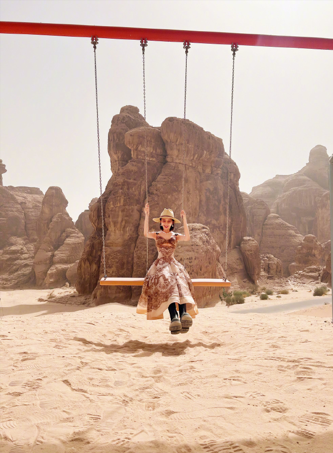 游完泳,她自顾自的玩起了秋千,随着秋千轻轻荡漾,她的裙摆飞扬,笑容灿烂。即使是在辽阔的沙漠中,这个秋千也显得别具一格,仿佛为这片荒凉的土地带来了一丝活力。她的笑容无忧无虑,仿佛回到了童年时光,享受着最纯粹的快乐。