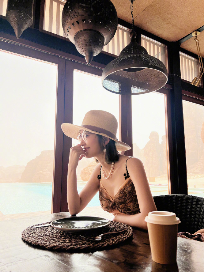 接着她坐在一个充满沙漠风情的咖啡馆内,眼神柔和地望向窗外。窗外是广袤的沙漠,而她的脸上带着温暖的微笑。咖啡馆内的柔和光线与窗外的沙漠景色交相辉映,让这一刻充满了宁静与温暖。唐艺昕品味着旅行中的每一刻。她在这一瞬间的从容与自在,无疑传达出她对生活的热爱与享受。