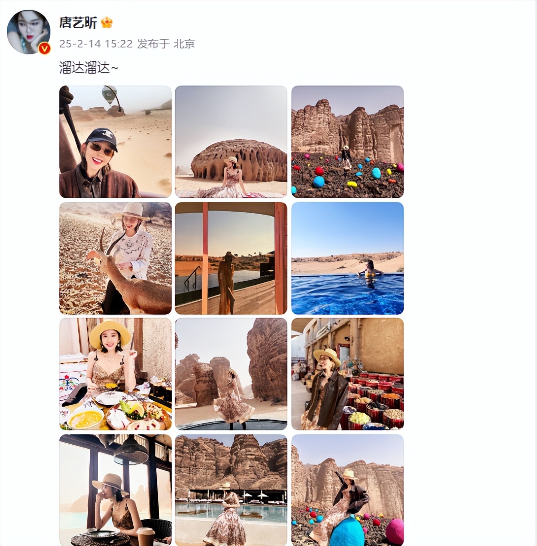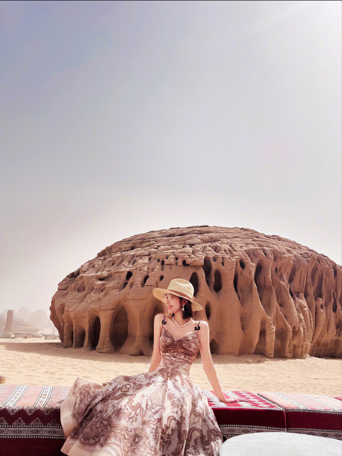 当天,唐艺昕穿着一袭印花长裙,坐在沙漠中的石桌旁,微风轻轻拂过她的发丝。远处是浩瀚的沙丘,而她与沙漠之间的距离仿佛被拉近了,裙摆在风中轻轻飘动,整个人显得既自由又优雅。情人节当天,她选择独自一人在这片沙漠中“溜达”,寻找自己内心的平静,也许这正是她想与大家分享的情人节心境。