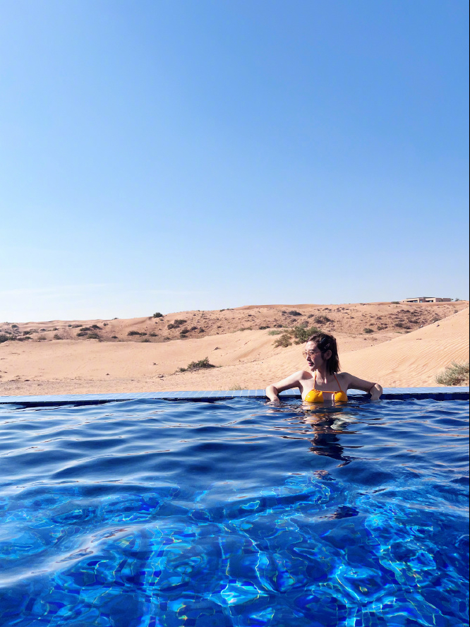 在沙漠中游泳可能是骆驼的梦想,而当天唐艺昕穿着黄色泳衣,坐在沙漠中的泳池边,享受着清凉的水面与无垠的沙漠景色。她微笑着看向远方,整个人散发出一种轻松与愉悦的氛围。泳池的清澈与沙漠的干旱形成鲜明对比,仿佛她在这片广袤的沙漠中找到了属于自己的避风港。