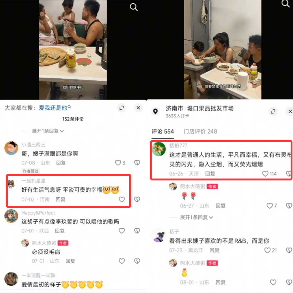 妻子是阿水视频的固定背景,也是阿水的伴唱和听众。她大概率是一个户外工作者,胳膊晒得黝黑,不施妆容,没有美甲。甚至在拍摄中,也没见他们开过美颜。每当音乐响起,阿水唱歌,妻子则一边照顾孩子一边跟着哼唱,时不时扭脸看他,眼里全是爱意。