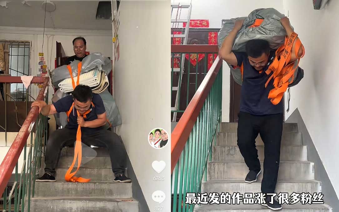 在置顶的一条微博中,阿水介绍自己“是一个在底层拼命挣扎的90后。我的日常,就是在每天送单和搬家的路上”。画面中,他扛起巨大的家具,一步一步走上台阶。白天,他是体力劳动者,晚上,就化身为歌唱达人,为自己减压,给他人带来快乐。