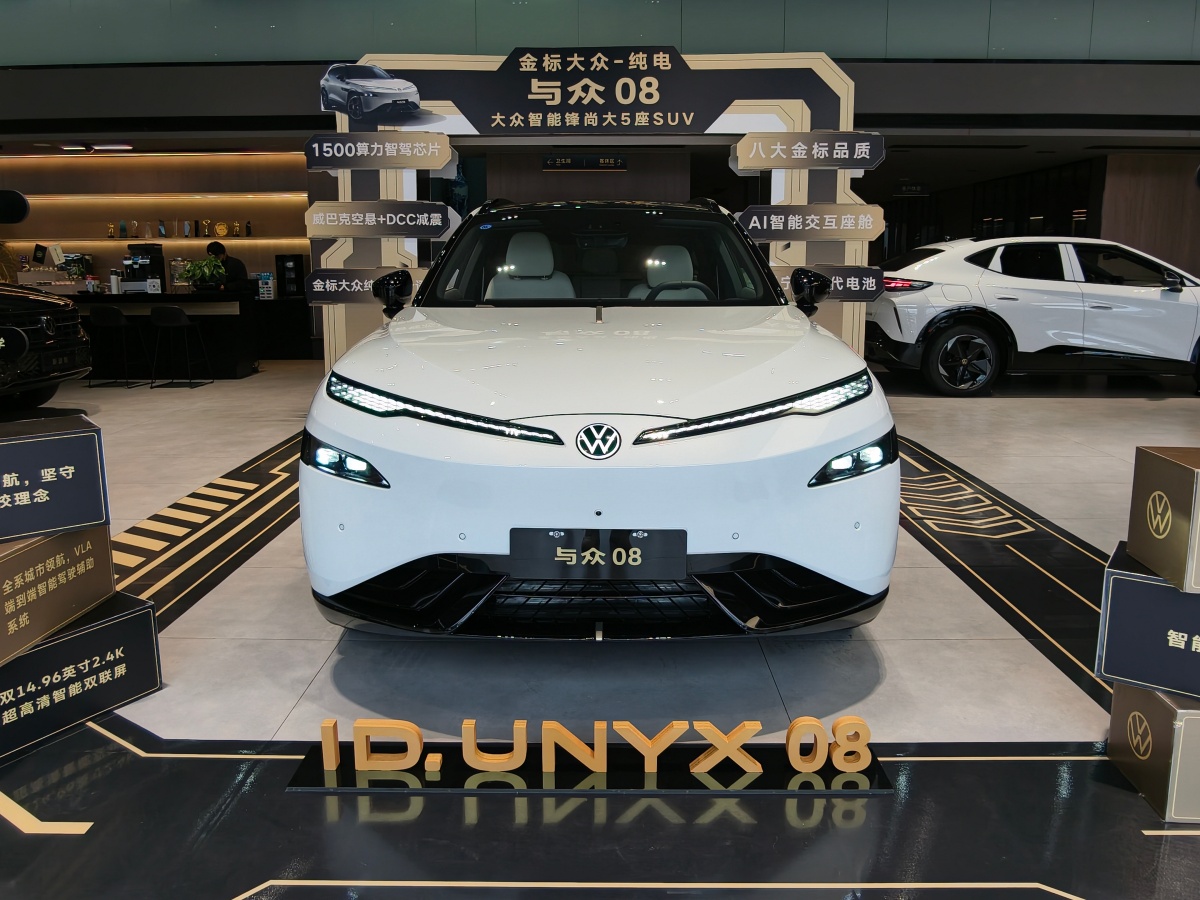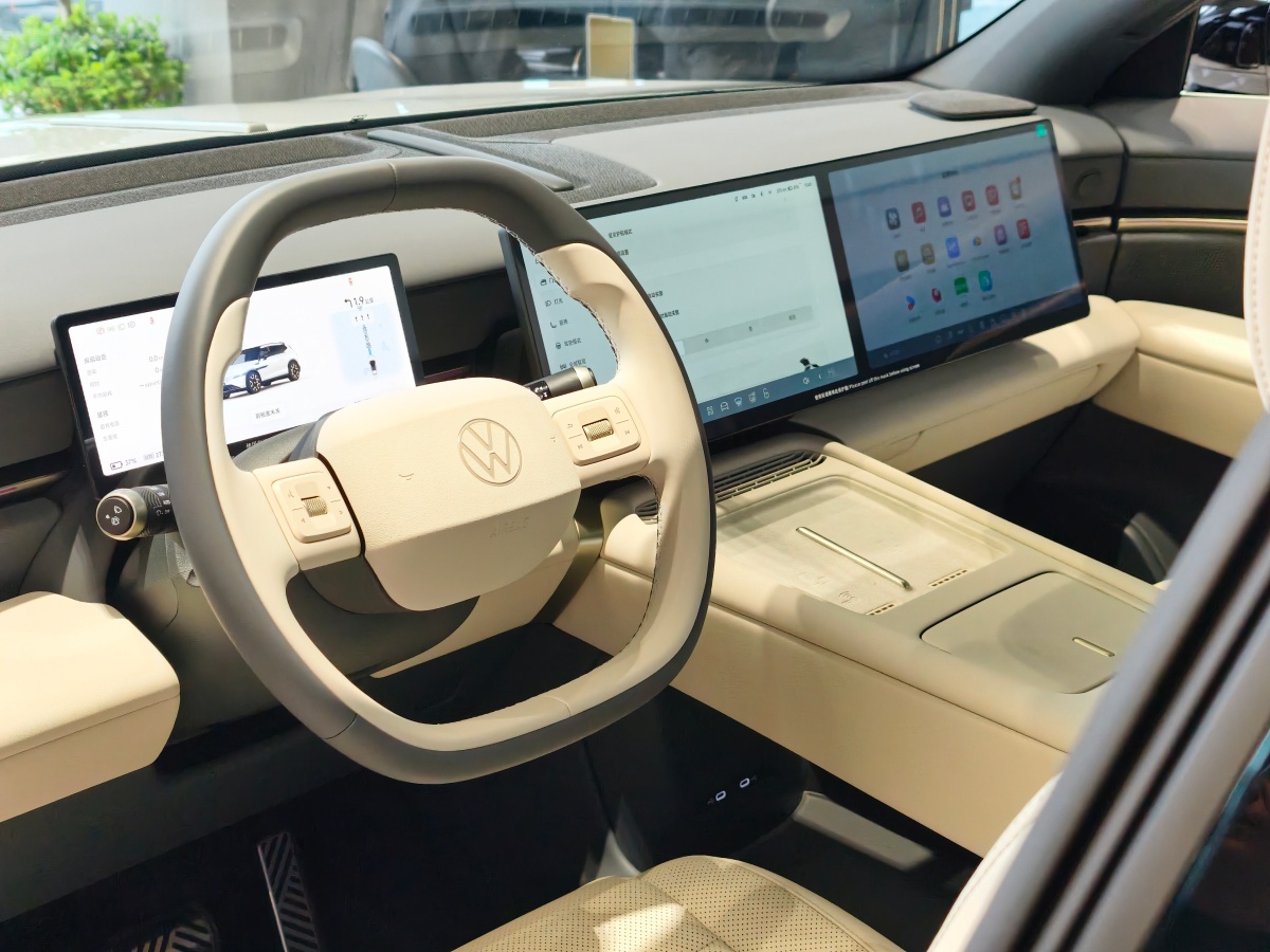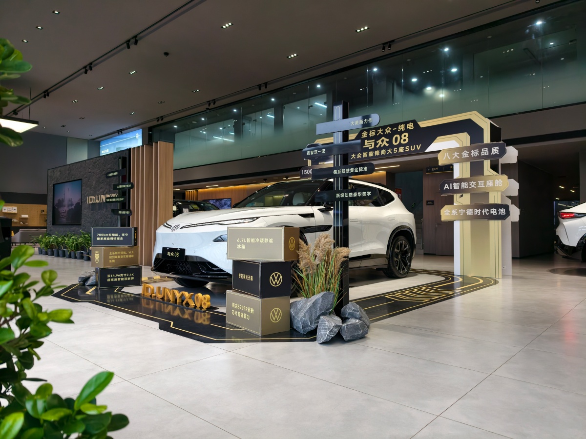 内饰与智能座舱:科技感与实用性的融合与众08的座舱采用环抱式布局,方向盘采用双辐式平底造型,中央镶嵌可发光VW徽标,集成电子怀挡、触控滚轮及常用功能实体按键。