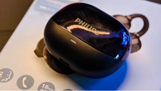 飞利浦TAT3469的耳机舱的配色很像剃须刀,个人觉得外观看起来很有成熟男士的味道。耳夹的发声单元和固定单元表面泛着宝石般的光泽,戴在耳朵上还是蛮高级的。佩戴方面,这款耳夹的材质不算十分亲肤,不过连接桥较紧,小耳朵佩戴的稳定性还不错。