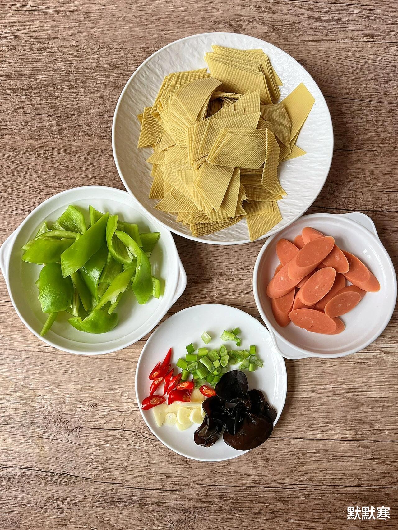 平底锅刷薄油,把火腿肠切片煎到两面微黄。这一步是秘密武器!煎过的火腿会释放出肉香,和干豆腐的豆香形成完美CP。煎好后盛出备用,锅里留底油爆香葱蒜和干辣椒,瞬间满屋飘香~