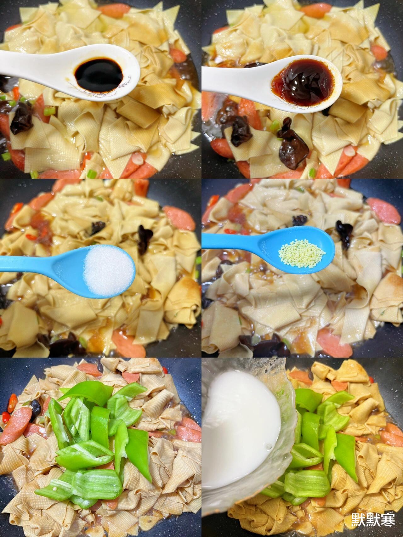 倒入干豆腐后马上加半碗清水(没过食材2/3),然后开始调味:2勺生抽+半勺老抽(上色用)+1勺蚝油+少许盐和鸡精。记住这个公式:2:0.5:1,保证汤汁浓郁又不齁咸!小火煮2分钟让干豆腐吸饱汤汁,最后放入尖椒片和煎好的火腿,开大火用水淀粉勾个薄芡(淀粉+水=1:3),汤汁变得浓稠能挂在食材上就大功告成!