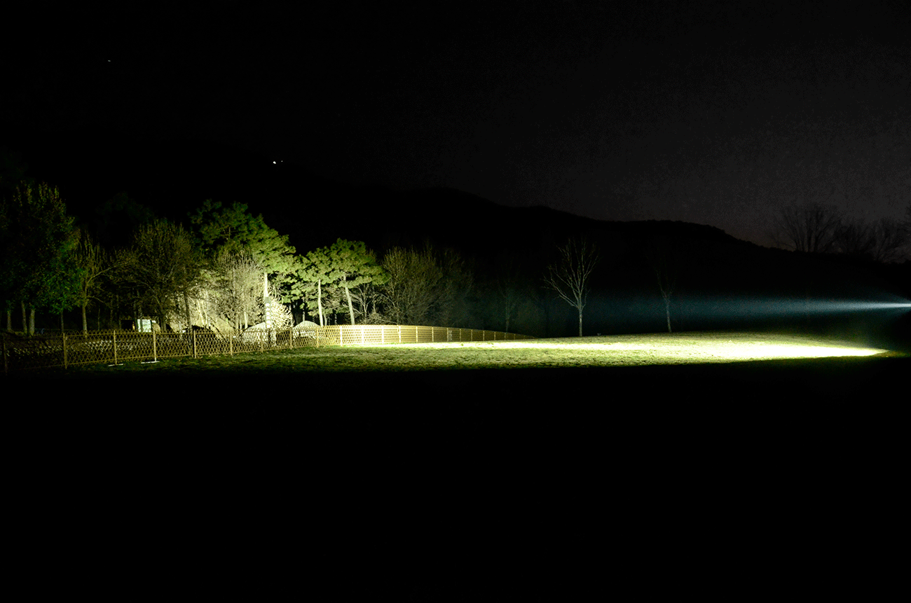 马赫5.0的泛光区也能形成非常开阔的照明视野,前方的路面整体都被手电的光线铺满,大范围的铺路效果,助你看得更加开阔,中心的亮度高让你看得更远。