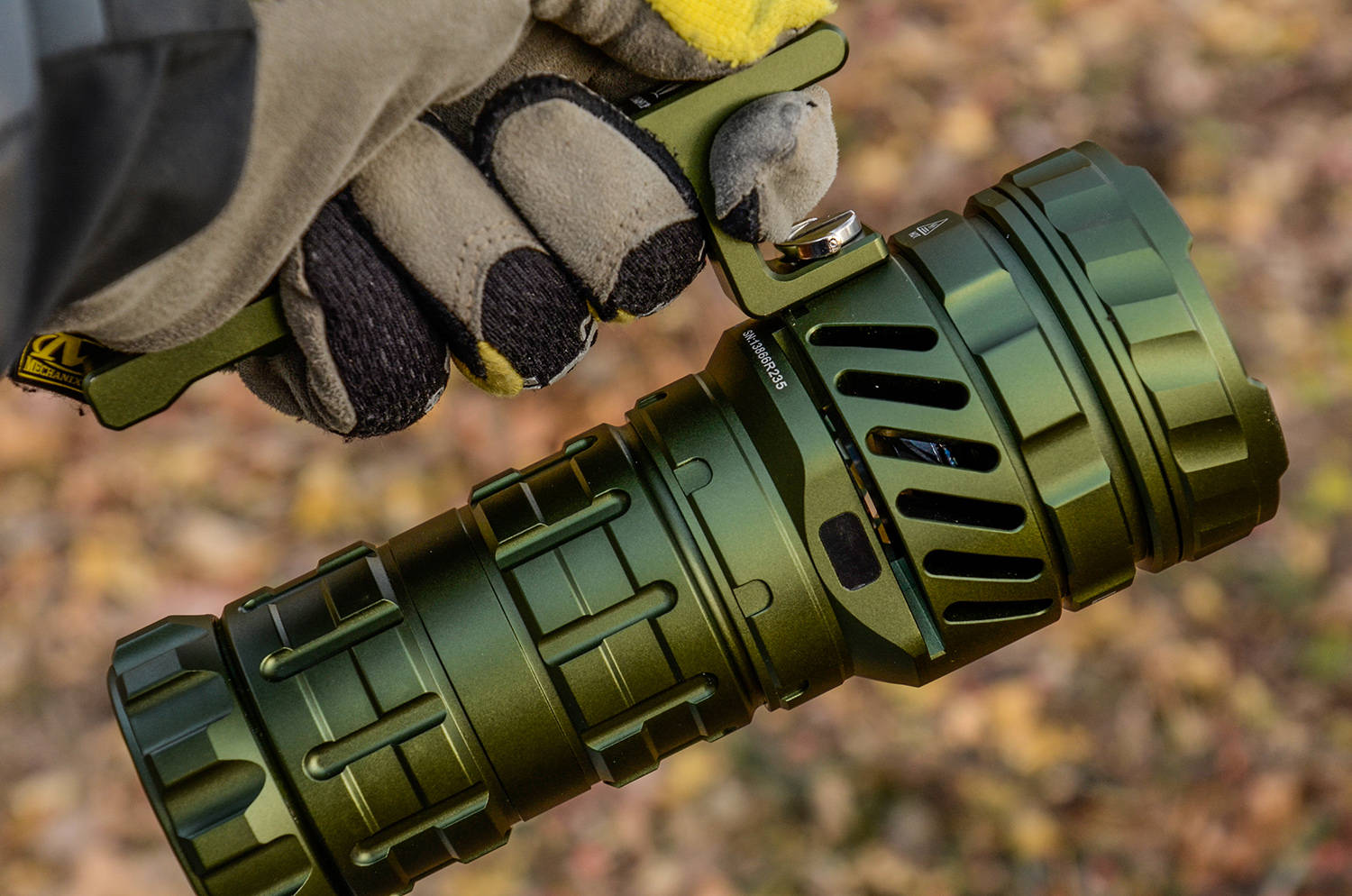 马赫5.0块头比较大,开关位于重心之前,单手握满手电筒身,拇指就能轻松搭在开关上,就能灵活操作,按键手感反馈清晰准确,便于掌控手电的浩瀚之光。