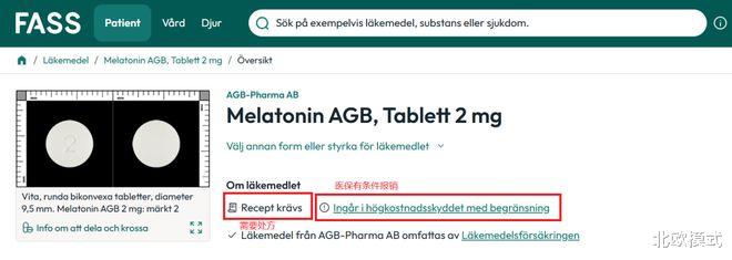 褪黑素(Melatonin)其实准确的说其实是医保“有条件报销”。 上瑞典药典fass.se可以看到它是Ingår i högkostnadsskyddet med begränsning。具体的报销条件是,患者必须是6到17岁之间的青少年,患有多动症,而且尝试过睡眠卫生措施(比如睡前避免电子屏幕,规律作息,优化睡眠环境等)无效。