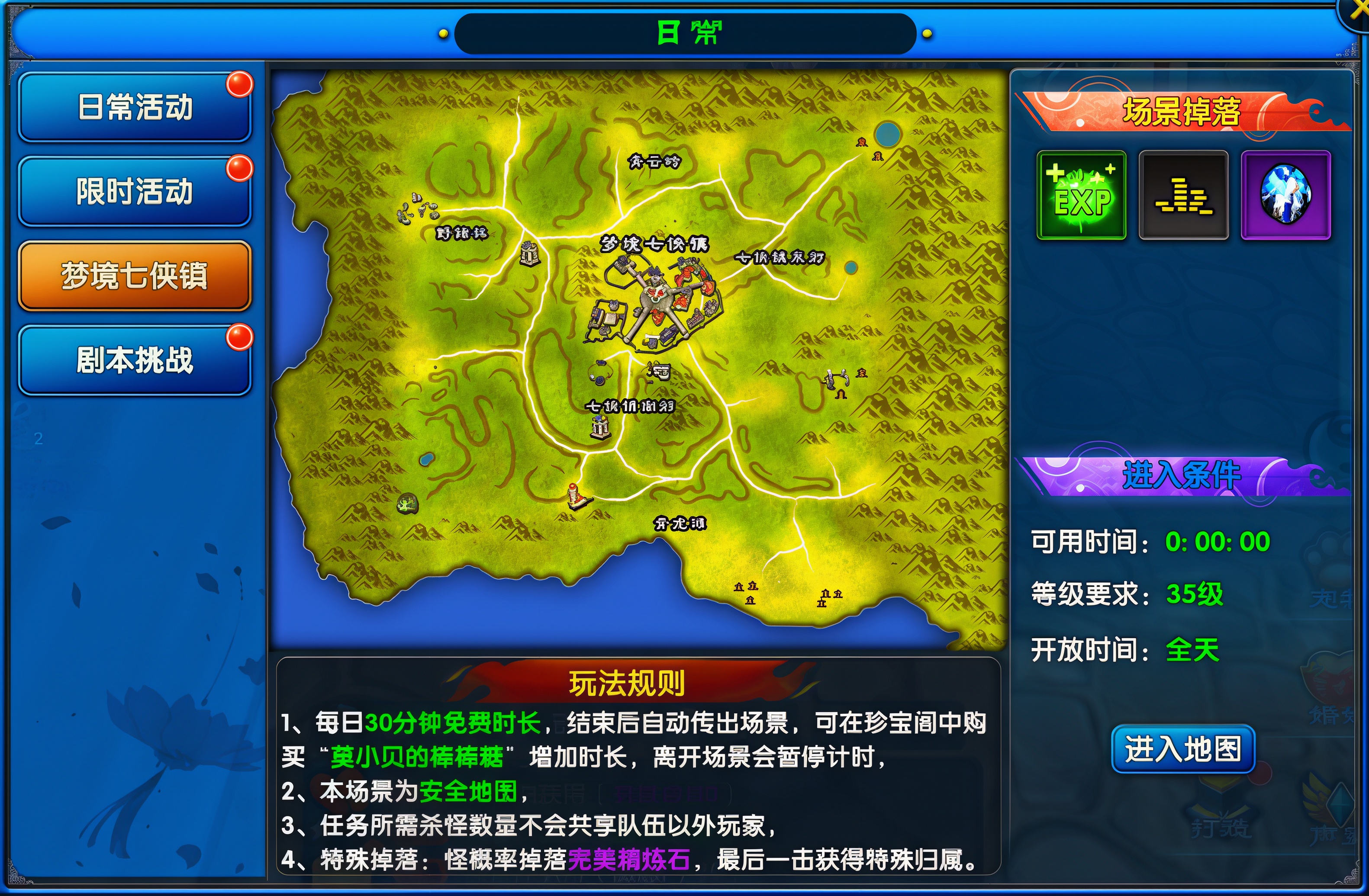 进入梦境七侠镇的核心门槛是角色等级达到35级,解锁后每日可享受30分钟免费时长,计时从进入地图的瞬间开始,免费时长不可累计,每日凌晨自动重置。免费时长结束后会被强制退出,若想延长刷怪时间,可在珍宝阁购买“莫小贝的棒棒糖”,能增加30分钟时长,每日限购24个,最多可叠加至12小时超长挂机时间。值得注意的是,中途退出场景时计时会自动暂停,未用完的时长可留到当日后续使用,无需担心浪费。