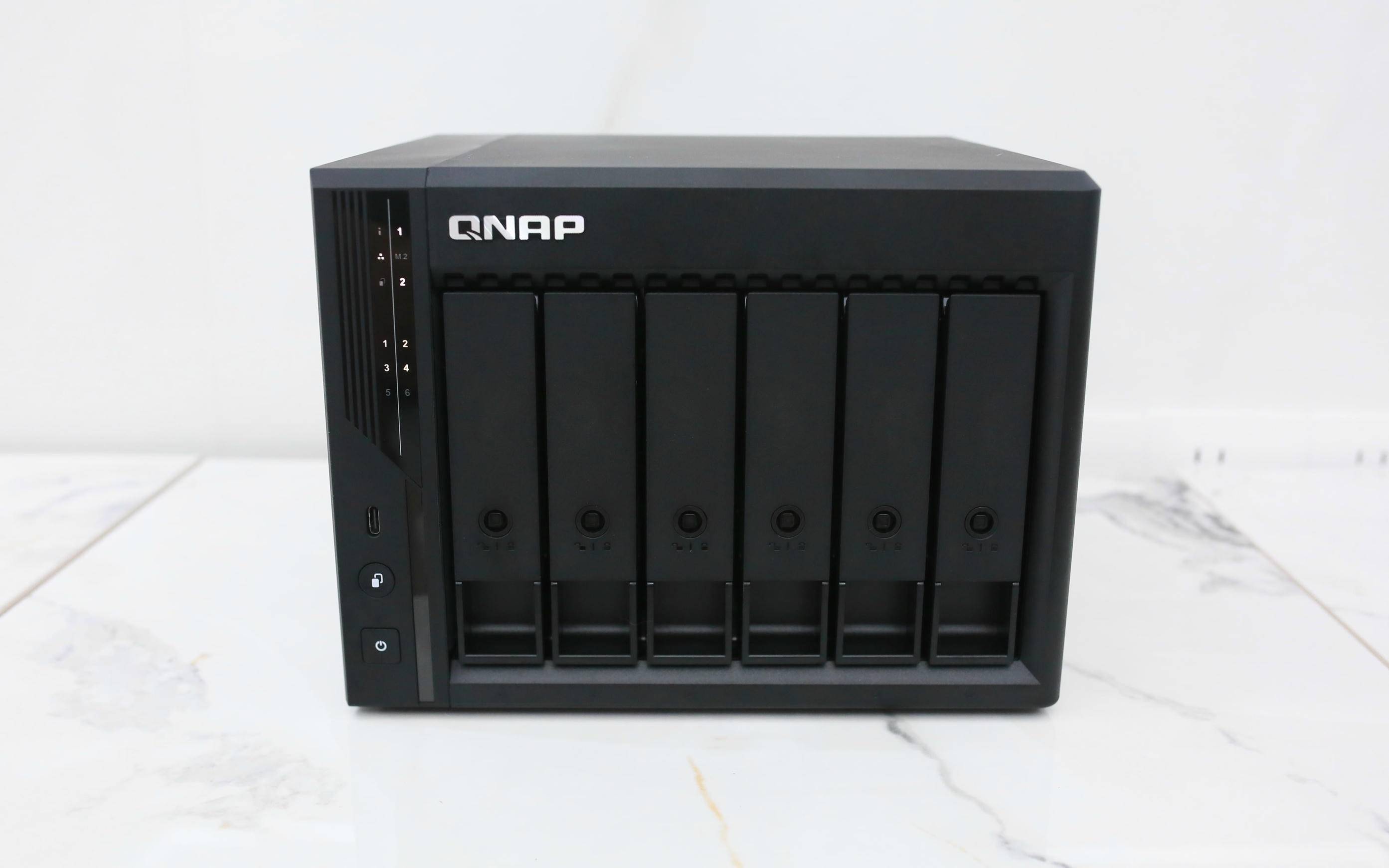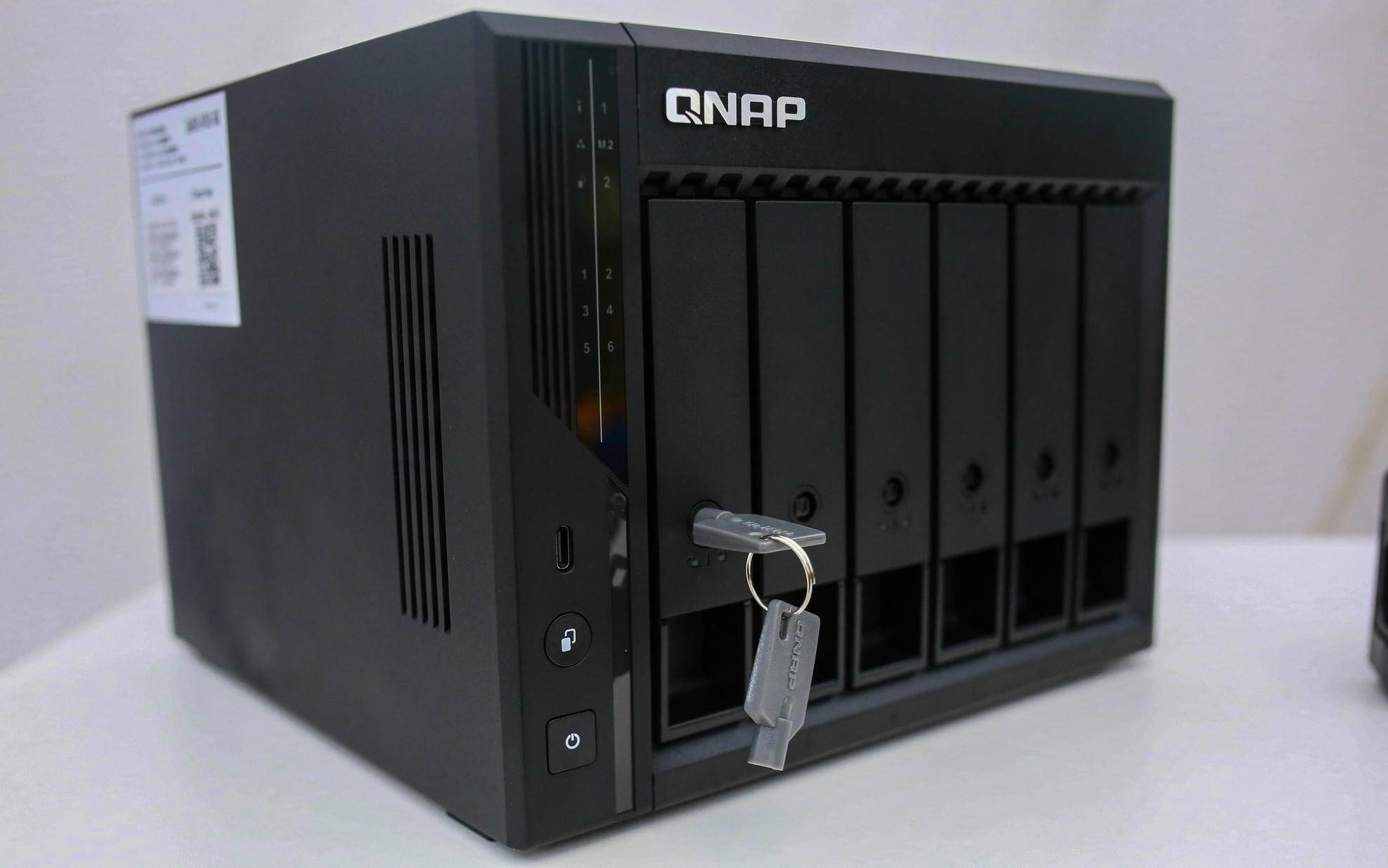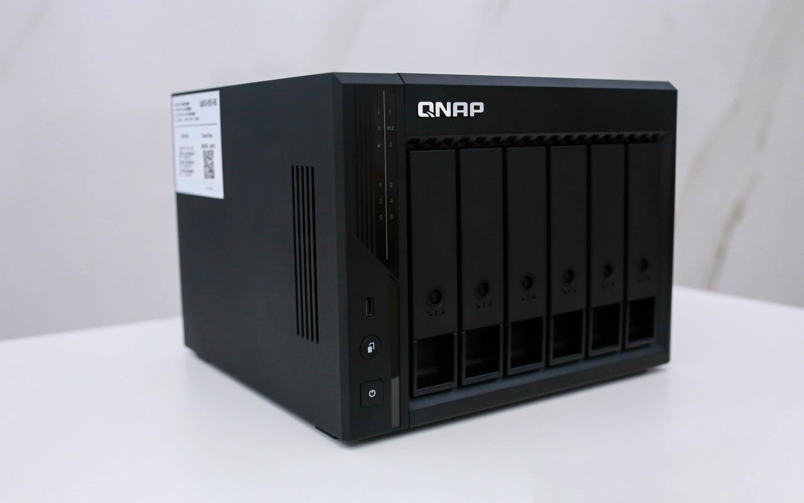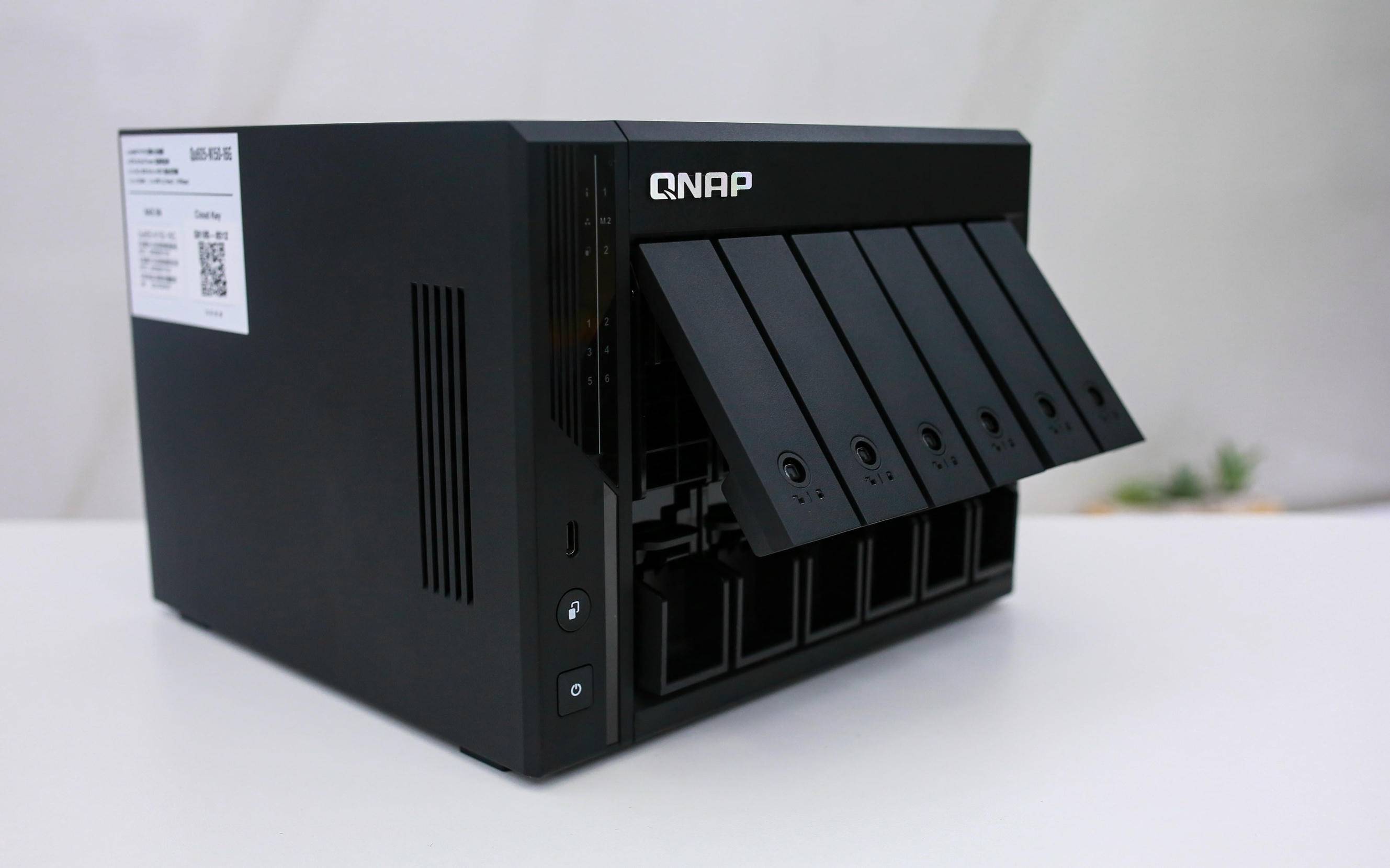 右侧的 QNAP 压模 LOGO 则是点睛之笔——金属质感细腻,光线下泛出柔和光泽,为这台以性能为主的 NAS 增添了一份高级感与设计气场。