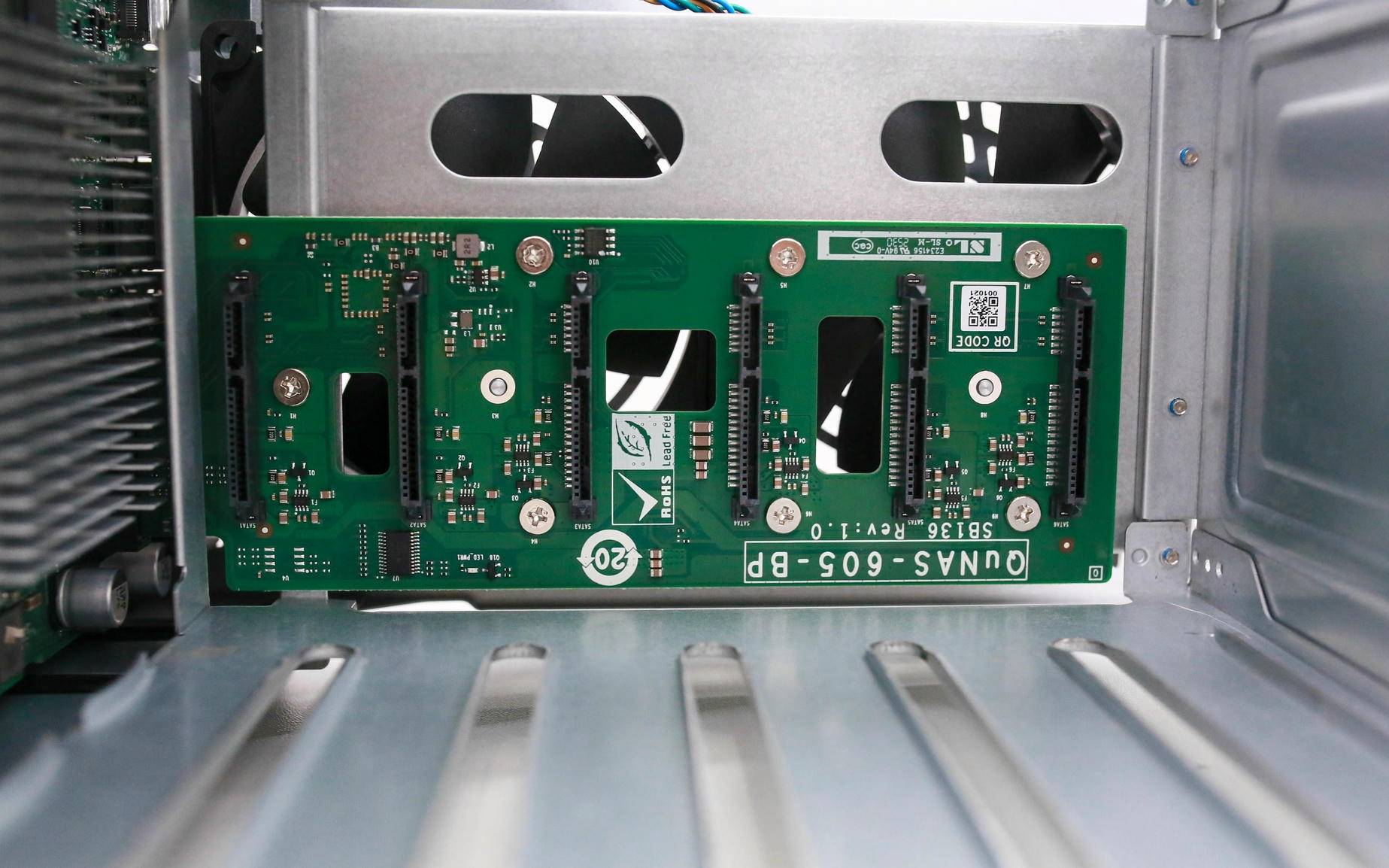 在背板部分,6 个 SATA 接口通过 PCIe 扩展板从主板转接,该方案以低功耗、高稳定性闻名,能有效降低长时间运行时的热量积聚。背板上密集的元器件与工整的焊点,充分体现出威联通在用料与制造工艺上的扎实功底。与一些成本取向的第三方产品相比,Qu605 的设计更注重长期运行的安全性与数据完整性,避免因电气波动或焊点老化造成的硬盘异常。