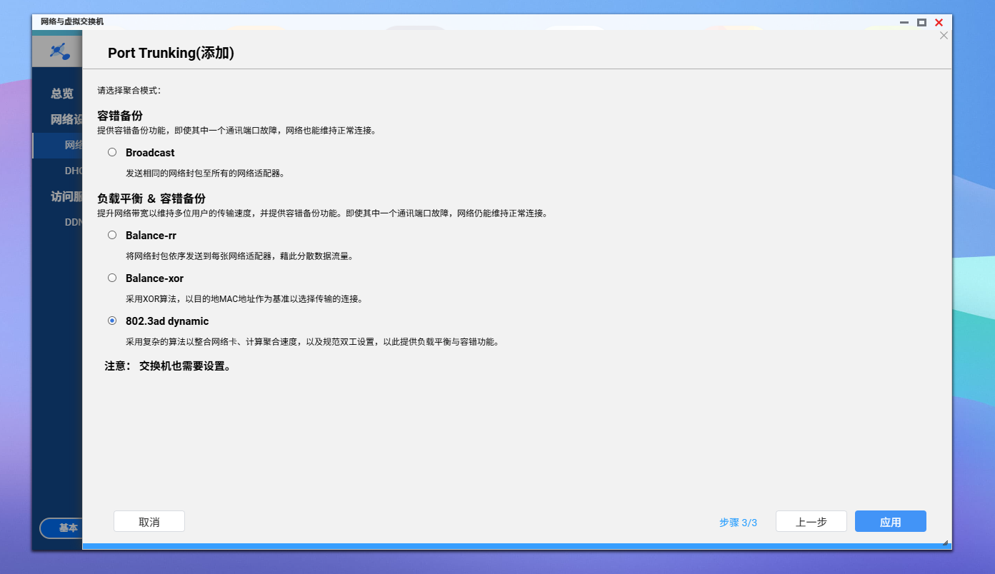 更重要的是,端口聚合还能提供网络容错与冗余保护。当某个网口或网卡出现故障时,另一网口可立即接管任务,确保服务不中断。威联通 NAS 支持多种聚合模式,包括静态与动态(LACP)聚合。如果你的交换机不支持 LACP,可选择 Balance-rr(bond0) 模式实现带宽分流;若支持 LACP,则启用动态聚合模式,进一步提升链路可靠性。正确配置后,Qu605 的网络潜力将被彻底释放,带来更高效的吞吐表现与更强的多任务并发能力。