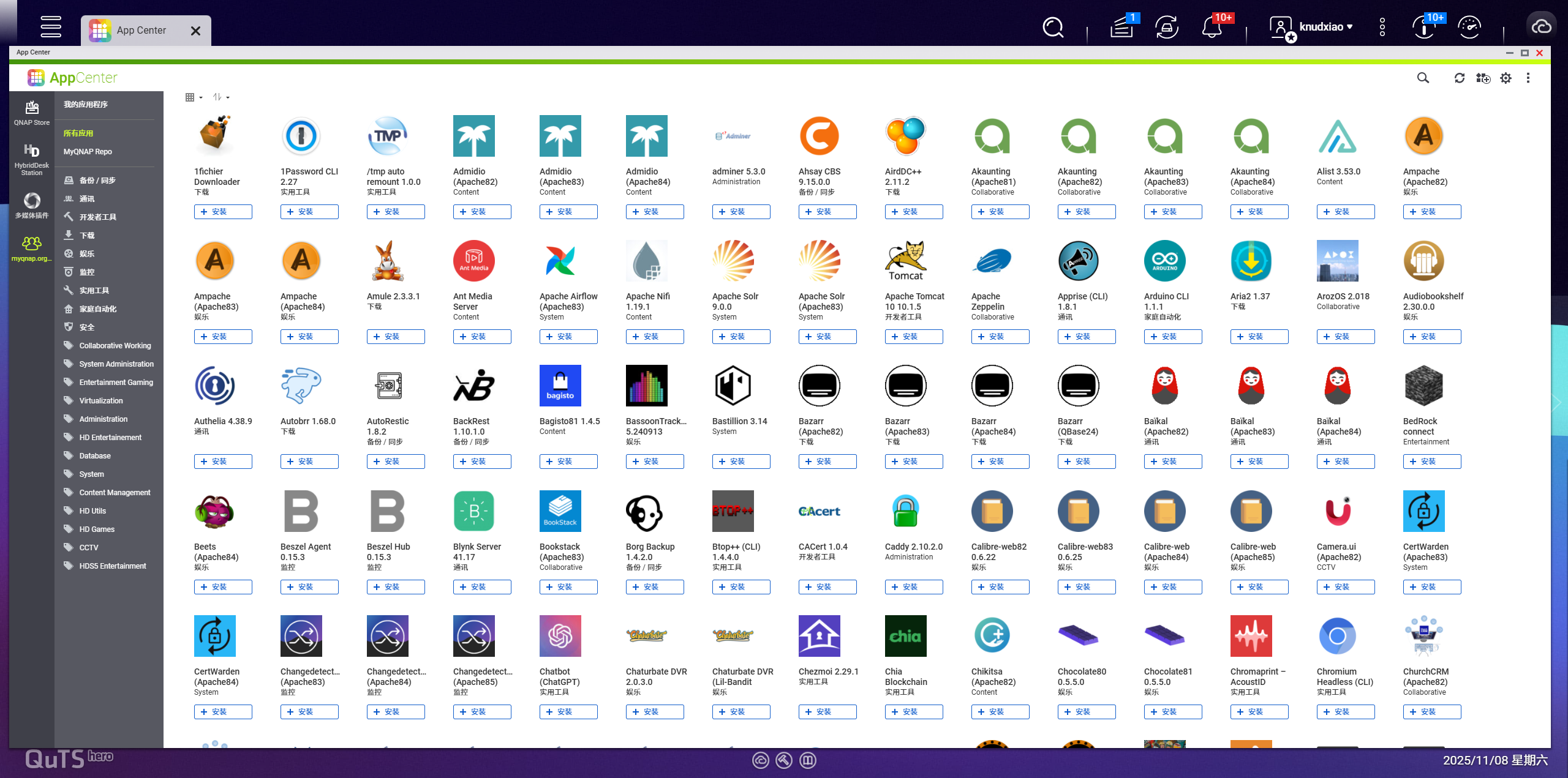 作为 NAS 行业的老牌厂商,威联通在软件生态上的积累堪称深厚。其自研的核心应用早已处于行业领先地位,包括虚拟化容器平台 Container Manager、智能备份工具 HBS3、混合云网关 HybridMount 以及强大的本地搜索引擎 Qsirch。目前官方 App Center 已收录近 50 款原生应用,另有多个来自社区与第三方开发者的扩展插件,覆盖备份、AI、影音、通讯、安全、监控等 11 大类别,构建出一个兼容性高、可扩展性强的应用生态体系。