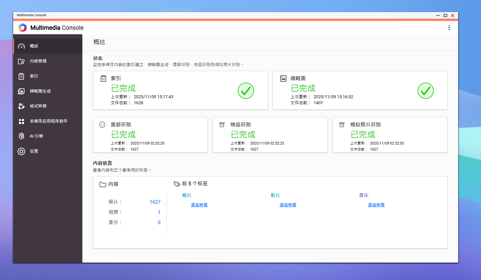 Multimedia Console 可谓是多媒体资源管理的核心中枢。它将索引生成、缩略图创建、面部与物品识别、相似照片比对、格式转换 等功能集中在同一界面中统一管理,并能直接调用QNAP AI Core 引擎 进行智能识别与加速处理。用户无需再分别打开多个软件,即可完成所有媒体内容的分类、识别与优化,实现真正的一站式多媒体智能管理。