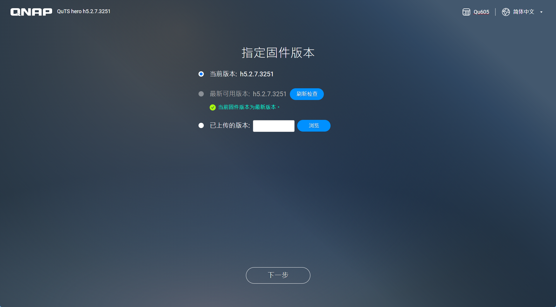 在 Qu605 的首次启动过程中,威联通提供了两种系统安装方式,界面直观、流程清晰。用户可以选择「启动智能安装」,系统会自动部署 QTS——这是面向家庭与轻度办公的默认方案,安装步骤最简便,几乎不需要额外设置。而对于有更高安全或专业需求的用户,则可以在「选择其他固件」中手动安装 QuTS Hero 系统。