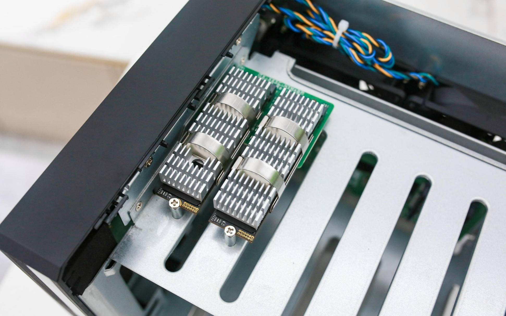 在硬盘笼的上方,威联通为 Qu605 预留了 两个 M.2 NVMe 2280 插槽,可灵活配置为 SSD 缓存或高速存储区。这样的设计让用户在大容量机械硬盘阵列之外,依然能享受到 SSD 带来的高 IOPS 与低延迟体验,尤其在数据库、虚拟机、AI 推理等高并发场景下优势明显。