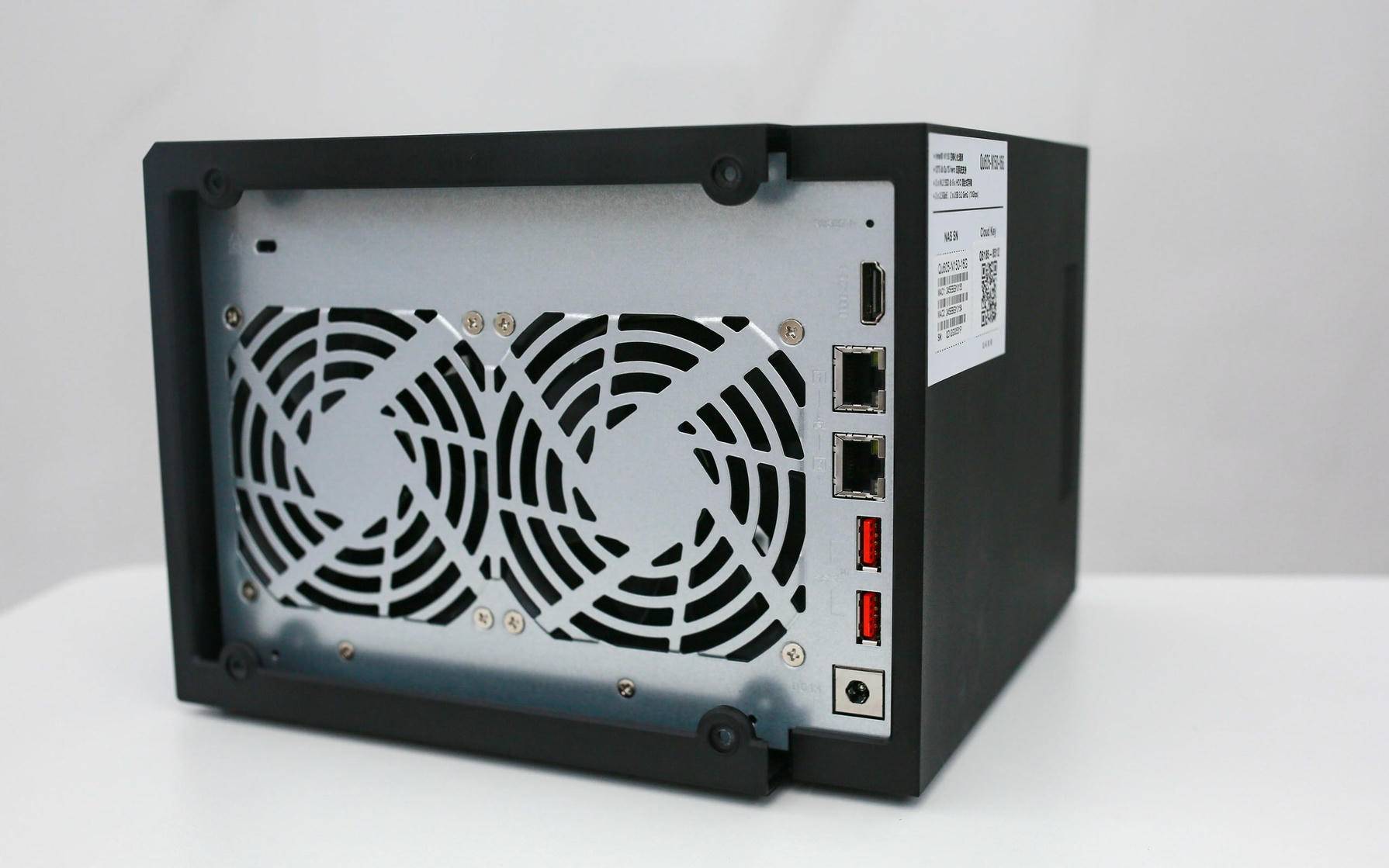 从背面看,Qu605 的设计依旧延续了威联通一贯的“低调专业”风格,嵌入于金属背板之中,视觉上毫不张扬,却透出沉稳质感。两枚硕大的静音风扇几乎占据了整个背板中心区域,形成前进风、后出风的高效散热路径。无论是多盘同时运行还是长时间数据写入,温度控制都能保持在安全区间,为设备稳定性打下坚实基础。