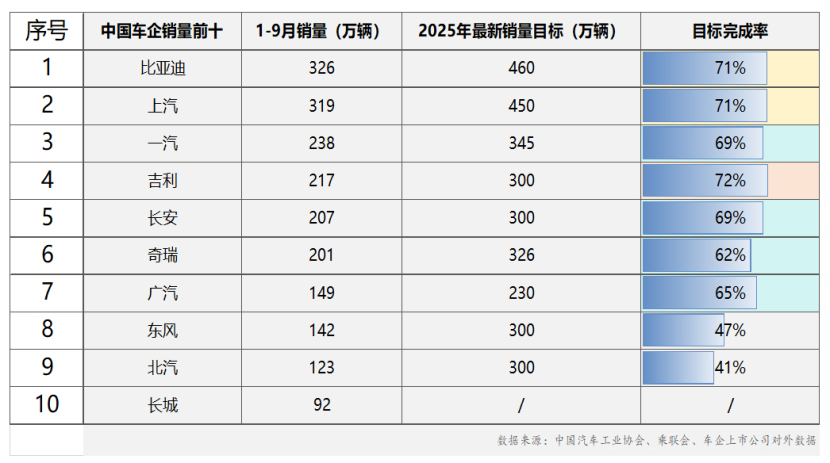 从销量前十车企的竞争格局来看,比亚迪与上汽集团共同占据第一梯队位置,1-9 月累计销量均突破 300 万辆。其中,比亚迪以 326 万辆的累计销量稳居行业榜首,已顺利完成其全年 460 万辆最新销量目标的 71%,凭借在新能源领域的技术优势与产品矩阵,持续巩固行业领先地位。上汽集团同期累计销量达 319万辆,全年目标完成率同样为 71%,在燃油车市场稳步推进、新能源车型加速布局的 “双线并行” 策略下,保持了稳健的增长节奏。
