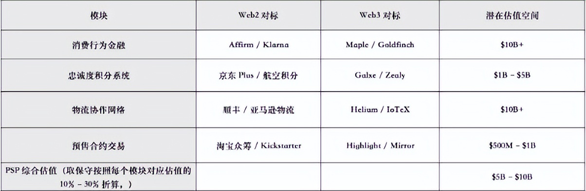 数十亿以上的估值从上方几个关键模块的行业对标情况来看,PSP 所代表的消费力生态系统,具备极强的价值拆解能力: