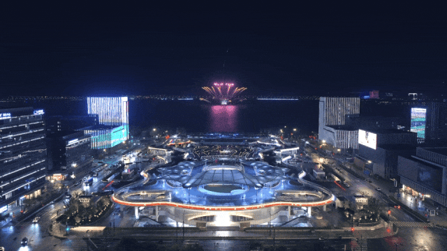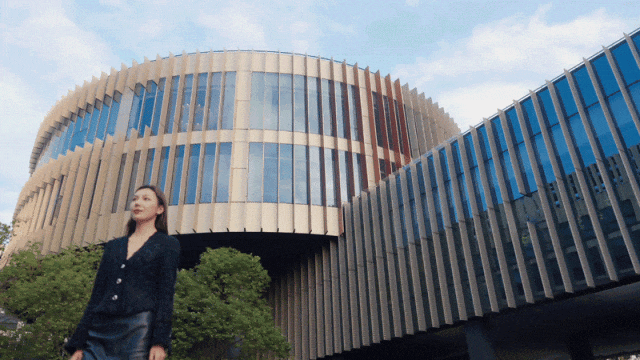 而长廊顶部的“时间之环”层层堆叠,如一缕青烟又似浮云朵朵,青蓝交织似水墨晕染,勾勒出滴水湖的悠然意境。