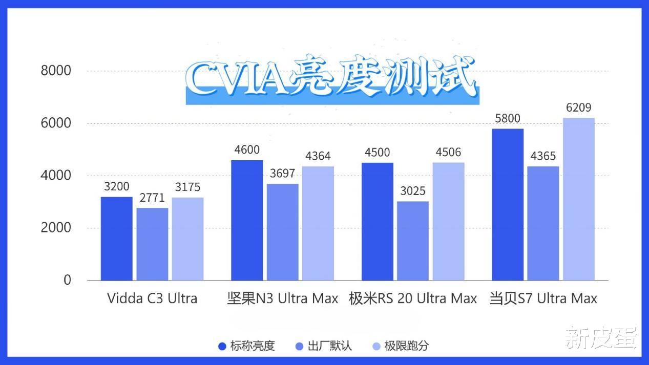 亮度表现上,四款客厅投影仪机型都展现出强劲实力。当贝S7 UltraMax以5800 CVIA流明领先,极米和坚果均超过4500 CVIA,Vidda则为3200 CVIA,实测在色彩可用、噪音可控的模式下,当贝S7 Ultra Max 的亮度表现也遥遥领先,具体数值看图。