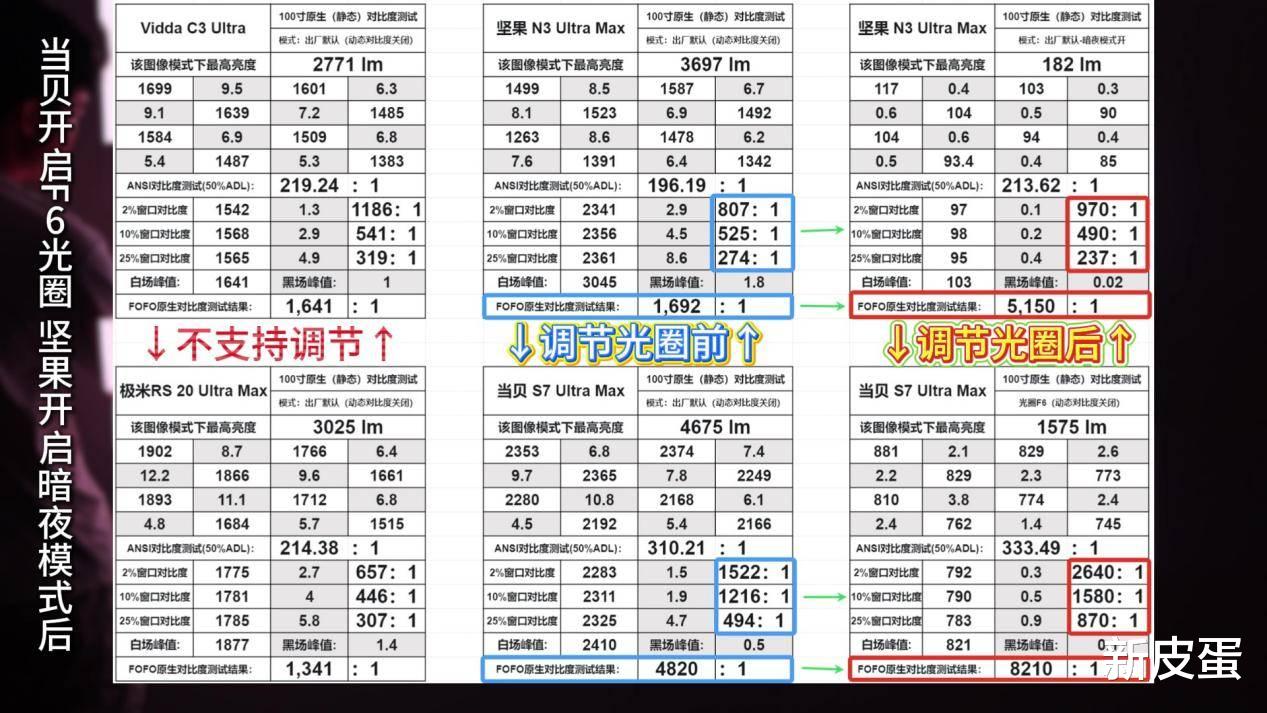 对比度方面,当贝S7 UltraMax具备五档光圈调节功能,在F6光圈下仍能保持1500流明亮度,同时实现8000:1的原生对比度。坚果支持"暗夜模式",开启后对比度提升明显,但亮度会锁定在182流明,使用条件较为苛刻。Vidda和极米不支持光圈调节,原生对比度约为1600:1。