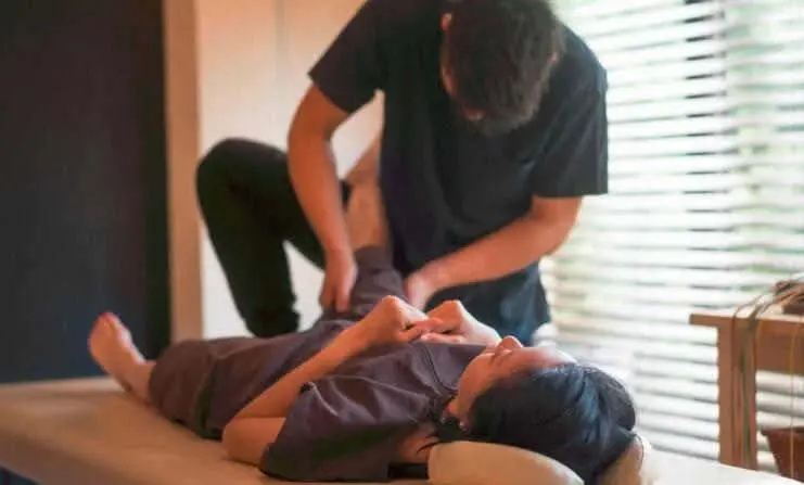 女人已经缓慢褪去了黑丝袜,撩起外套露出完美的腰线,趴在了按摩床上。