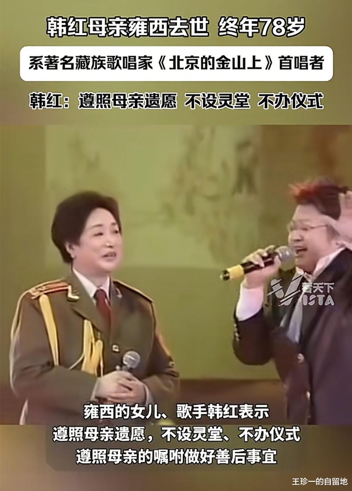 只是即使再难过,韩红也要回应外界对她母亲去世一事的关注,她说遵照母亲的遗愿,不设灵堂、不办仪式,她将遵照母亲的嘱咐做好善后事宜。
