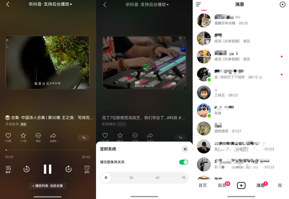 除了团购这个核心亮点,新版本在细节优化上也有不少改进。比如现在能实时看到好友是否在线,朋友间分享视频、聊天更及时、更方便。毕竟对着不在线的朋友说一大堆,多少有点失落。而对于喜欢“听抖音”的朋友,鸿蒙版抖音也贴心安排了听抖音点赞功能,喜欢的音频直接点赞收藏,之后找起来更方便。