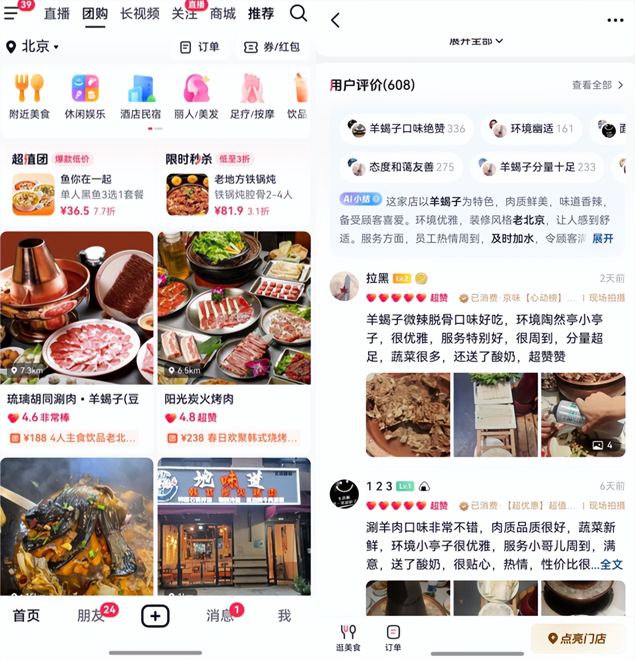 最重磅的团购功能当然得先说。平时我就爱刷抖音看美食探店视频,但之前看到心仪的店铺,总得切换到其他APP找门店信息、查优惠活动。现在只要点鸿蒙版抖音顶部的“团购”入口,就能直接选购下单,整个过程十分顺畅。并且还能在这里看到其它用户的真实评价和印象标签,这个设计特别贴合日常消费的实际需求,可以帮助我们精准“排雷”。