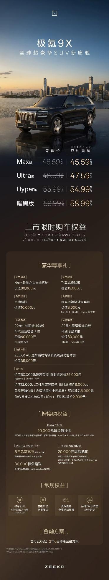 2025年9月29日至2025年12月31日,支付定金20,000元的用户,可享的限时购车权益,包括:免费赠送价值60,000元的Naim殿堂之声音响系统;免费赠送价值15,000元的飞翼式滑移屏;免费赠送价值10,000元的电动踏板;免费赠送价值8,000元的哑光银镀铬外观套件;免费赠送价值40,000元的22英寸镜面锻造轮毂带六活塞橙色卡钳(Hyper版可享);免费赠送价值30,000元的22英寸星耀锻造轮毂带四活塞卡钳(Max版和Ultra版可享);免费升级价值35,000元的ZEEKR AD 进阶辅助驾驶系统终身功能体验;价值60,000元的曜黑套装,限时选装价25,000元(Hyper版和Ultra版可享);价值12.000元的二排双旋转座椅,限时选装价6,000元;单双屏随心选(如选择16英寸中控单屏尾款可减免5,000元);7kW智能家充桩套餐(10米)限时选装价2,999元。同时,还提供10,000元超级置换金,用户可使用本人或亲友旧车行驶证(不限旧车品牌、公户/个人户)申请,用于订单尾款减免;极氪品牌新车首任车主增换购极氪9X,可享五年免费充电权益(每年1,000度),或吉利汽车集团旗下品牌现任车主增换购极氪9X,赠送30,000极分;搭载非千里浩瀚辅助驾驶系统的极氪001系列、极氪009系列车型首任车主,购买极氪9X可享20,000元尾款抵扣。
