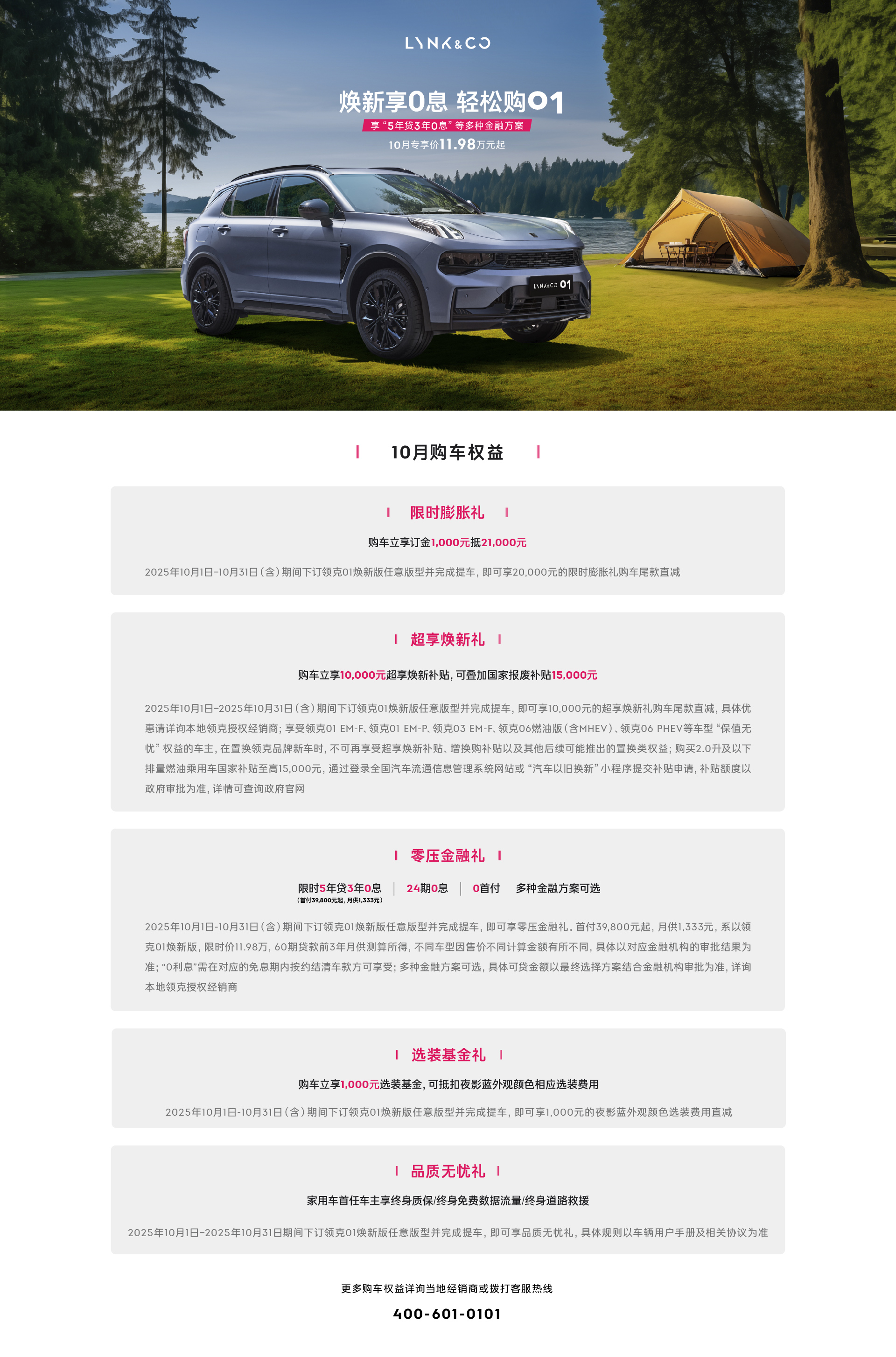 除了产品力扎实,十月领克01焕新版还推出了一系列诚意满满的购车福利。目前车型限时起售价为11.98万元,配合"焕新享0息轻松购01"金融政策,确实让很多年轻人或小家庭心动。具体政策包括限时膨胀礼:订金1000元直接抵21000元车款,相当于立减2万元;超享焕新礼:10000元专属补贴,还能叠加国家报废补贴15000元;零压金融礼:主推"3年0息",首付3.98万起,前36期月供仅1333元,压力不大,也支持24期0息或0首付等多种灵活方案;选装基金礼:赠送1000元选装基金,可用于选装夜影蓝车色等配置;品质无忧礼:首任车主享终身质保、终身免费流量、终身道路救援,用车更省心。从整体来看,政策覆盖了购车、用车、养车多个环节,对实际购车家庭来说非常实在。