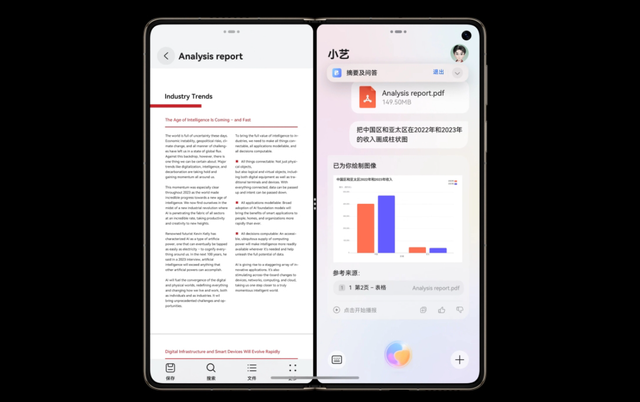 以浏览小红书、抖音等APP为例,华为Mate X6可以把它们以“左内容,右评论”的布局在大屏上,用户可以边看内容边刷评论,显著提升阅读效率。工作时也是同理,阅读PDF文档时,华为Mate X6可以同时在大屏上显示目录与正文,让用户的阅读效率翻倍。另外,凭借全景多窗功能,华为Mate X6最多支持三个应用同时运行并切换,还能保持大视野浏览,成为用户在处理数据比对、网购比价等多任务时的高效小帮手。