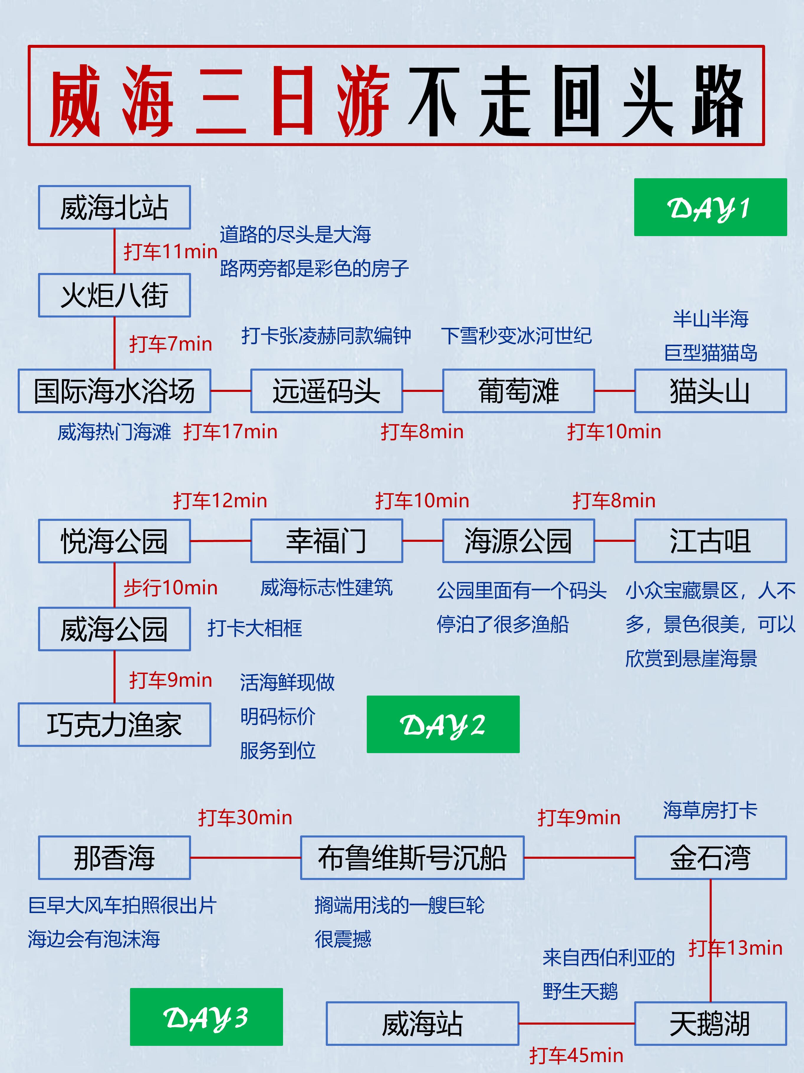 DAY1:威海北站—火炬八街—国际海水浴场—远遥码头—葡萄滩—猫头山