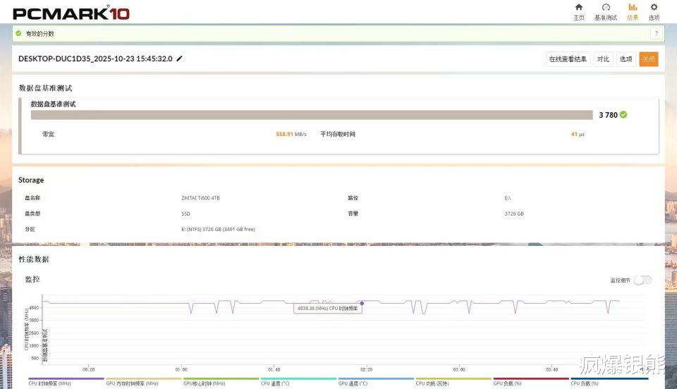 对于设计、剪辑和办公用户,这里我也用PCMark10的存储基准做了测试,致态Ti600 4TB得分3780,带宽558.91MB/s,平均存取时间41微秒,性能非常优异。