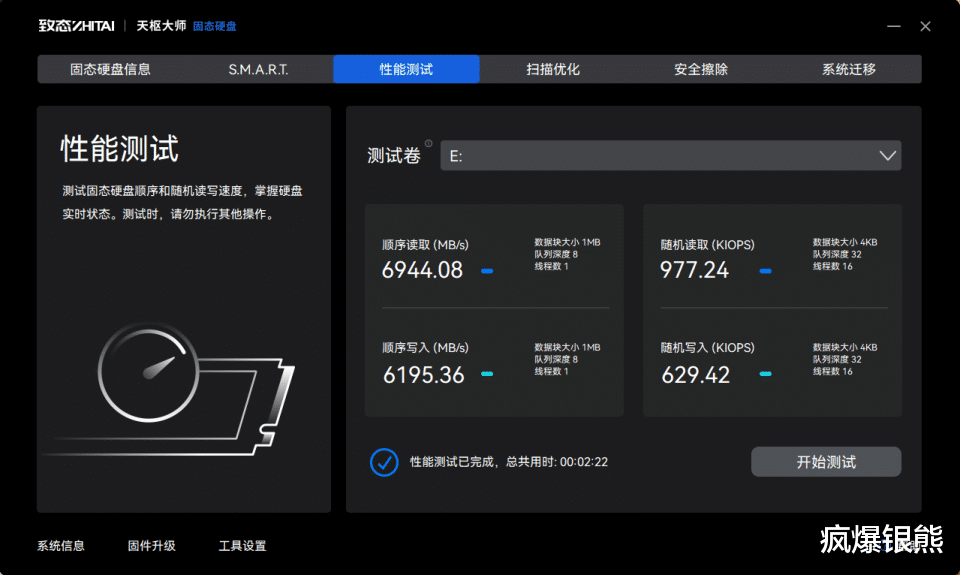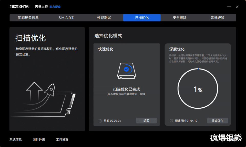 另外我们还能在软件中查看SMART信息,掌握SSD健康状态;内置的性能测试工具没事可以测试下;存储内容多了后,没事也可以通过快速和深度扫描优化提升硬盘数据完整性。