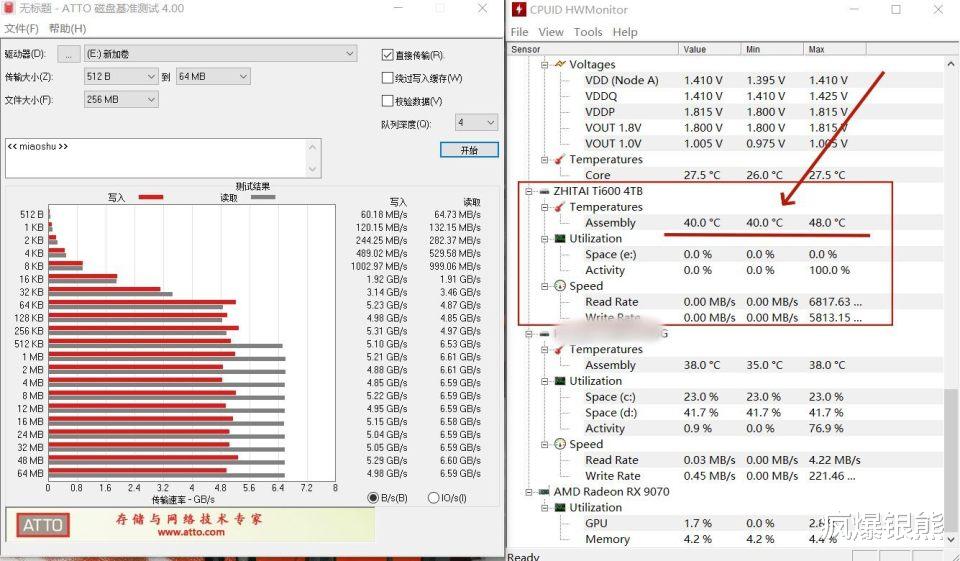 如上图划线部分,实测致态Ti600最高温度显示为48°C,最低也即40°C,就这个表现而言,不用散热马甲确实也没啥问题。