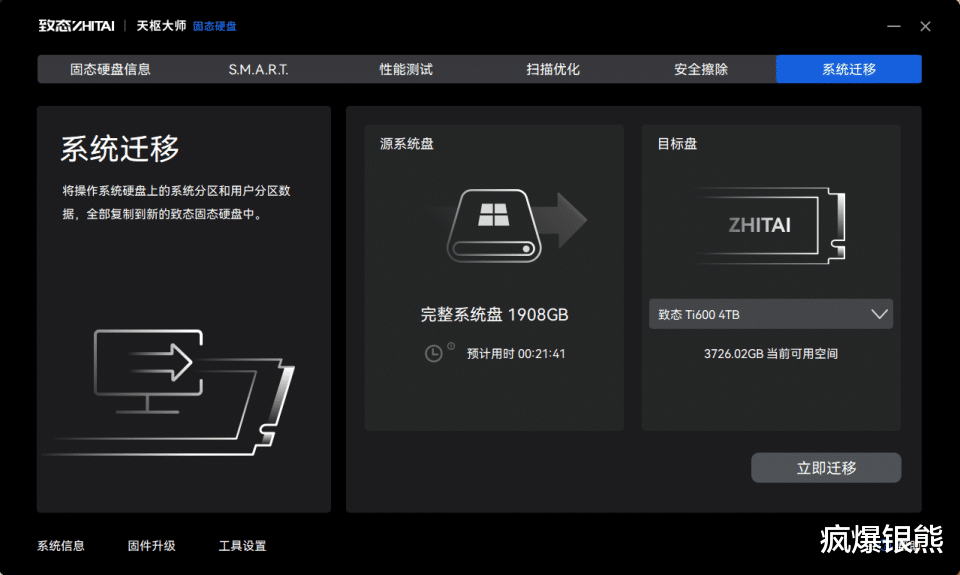 系统迁移是我觉得最有用的一个功能,它可以帮我们把小容量和老式硬盘中的数据全部复制到致态Ti600 上。