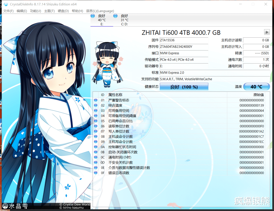 致态Ti600采用无外置DRAM缓存设计,支持HMB(Host Memory Buffer),采用的SLC模拟技术实现了更高速的缓存,设备不再卡顿。上机后我也用CrystalDiskInfo查看了基本硬件信息,上机温度在40℃,硬盘健康状态是100%,支持S.M.A.R.T,TRIM,VolatileWriteCache功能。