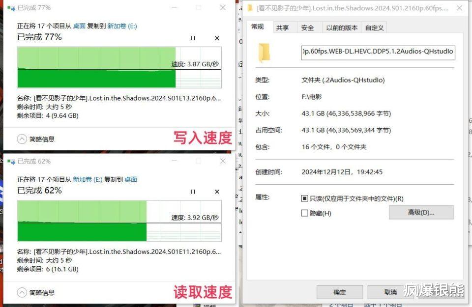 对于视频工作者而言,往往需要传输一些较大的单个文件,这里我也做了测试,43.1GB的4K视频文件,读写速度如上图,写入3.87GB/s,读取3.92GB/s,传输曲线也很稳,速度上只比碎片化文件高一些。