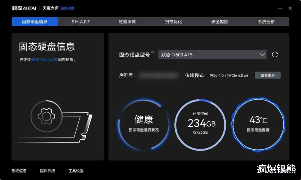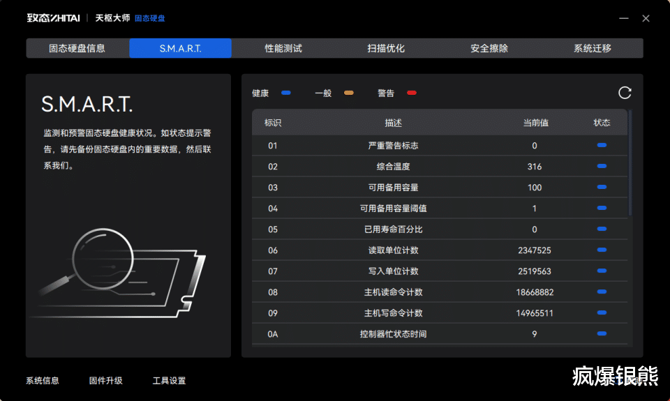 为了方便用户随时掌握SSD健康状态,致态也为自家的SSD研发了致态天枢大师固态硬盘管理软件,软件安装后能够自动识别SSD型号,健康与否,用了多少容量,当前温度都能一目了然。