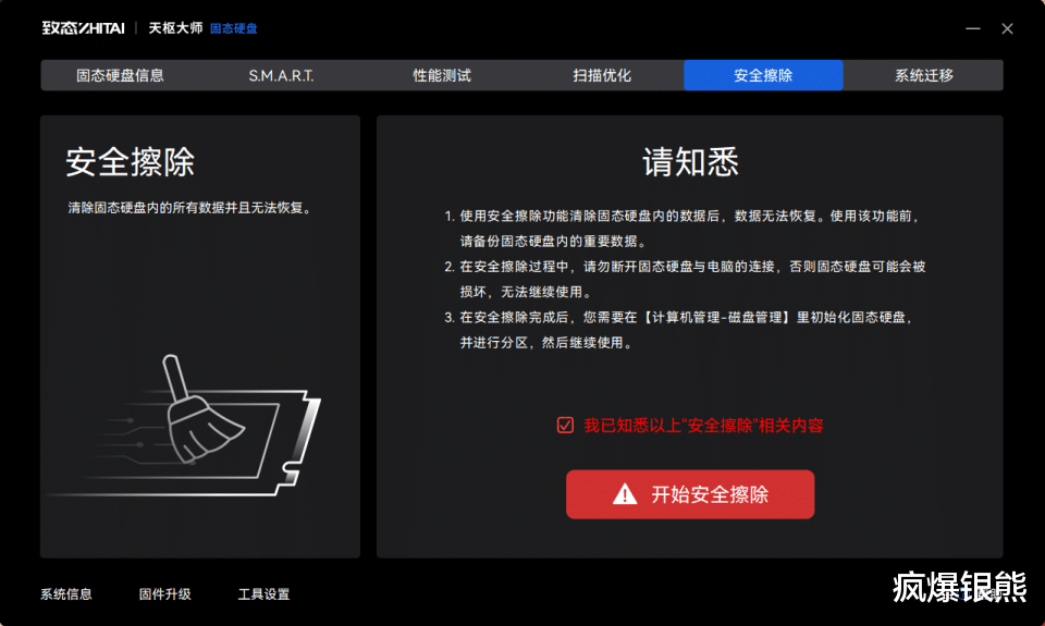 硬盘不想用了,如何安全擦除,打开软件点击安全擦除就能快速帮我们把个人数据给清理掉,安全擦除后别人想要恢复数据了解你的隐私那几乎没有可能。