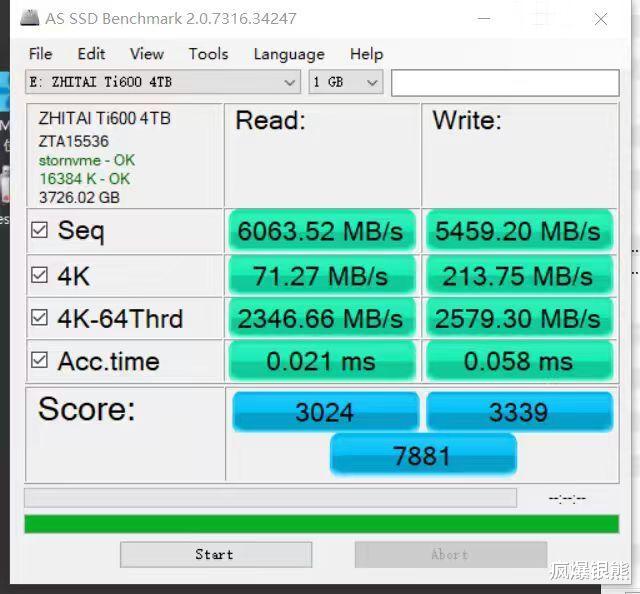 相比起CrystalDisk比较看重峰值数据,AS SSD则更均衡,其采用的平均数据值测试方式,经过多次测试,最终AS SSD得分7881,连续读取速度为6063MB/s,写入速度为5459MB/s,表现可圈可点。