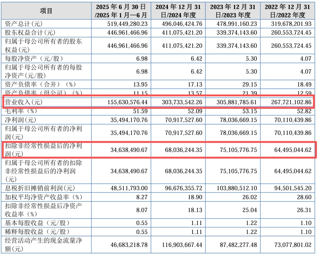 2025年上半年,海圣医疗业绩虽现回暖迹象——营收1.56亿元,扣非归母净利润3,463.85万元,同比分别增长22.56%和24%,但北交所在第二轮问询中直指核心关切,明确要求公司说明“导致2024年业绩下滑的因素是否已经消除”。