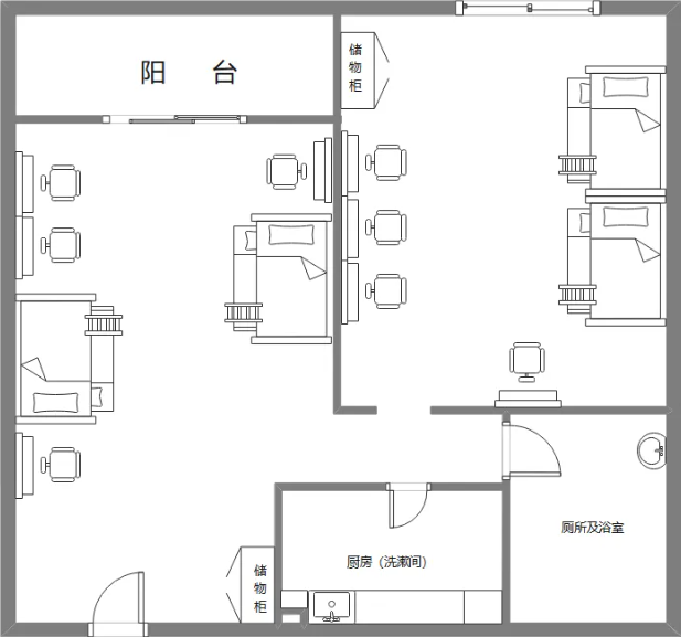 同理,八人间虽然人数更多,但整体环境较六人间进一步提升,宿舍面积更大,划分为四个不同的区域,不仅配备阳台、空调、干湿分离卫生间,还设置了厨房,在功能上几乎与一套小户型商品房无异。可见,广东医始终以舒适度为出发点,随着宿舍人数的增加,会在面积、设施、布局等方面做出一定调整,学生无论被分到哪种宿舍,都会拥有相当舒适的住宿环境。