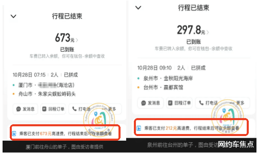 10 月 28 日一早,苏先生接上厦门出发的两位乘客,对方当场又支付了 673 元高速费。之后他绕道泉州接上第二单乘客,先顺路前往台州。到达台州后,厦门单的乘客表示后排坐三人较挤,且自己着急赶目的地,希望苏先生不要再接单,直接走最近的高速前往舟山。