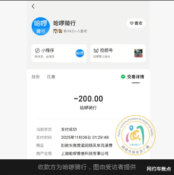 迫于无法接单的压力,苏先生于 2025 年 11 月 6 日凌晨支付了这 200 元,但付款后发现,收款方并非顺风车相关账户,而是 “哈啰骑行”,这让他对乘客是否能收到该笔返还费用产生了严重质疑。目前,苏先生已向平台所在地的上海 12345 进行了投诉,事件仍在进一步处理中。