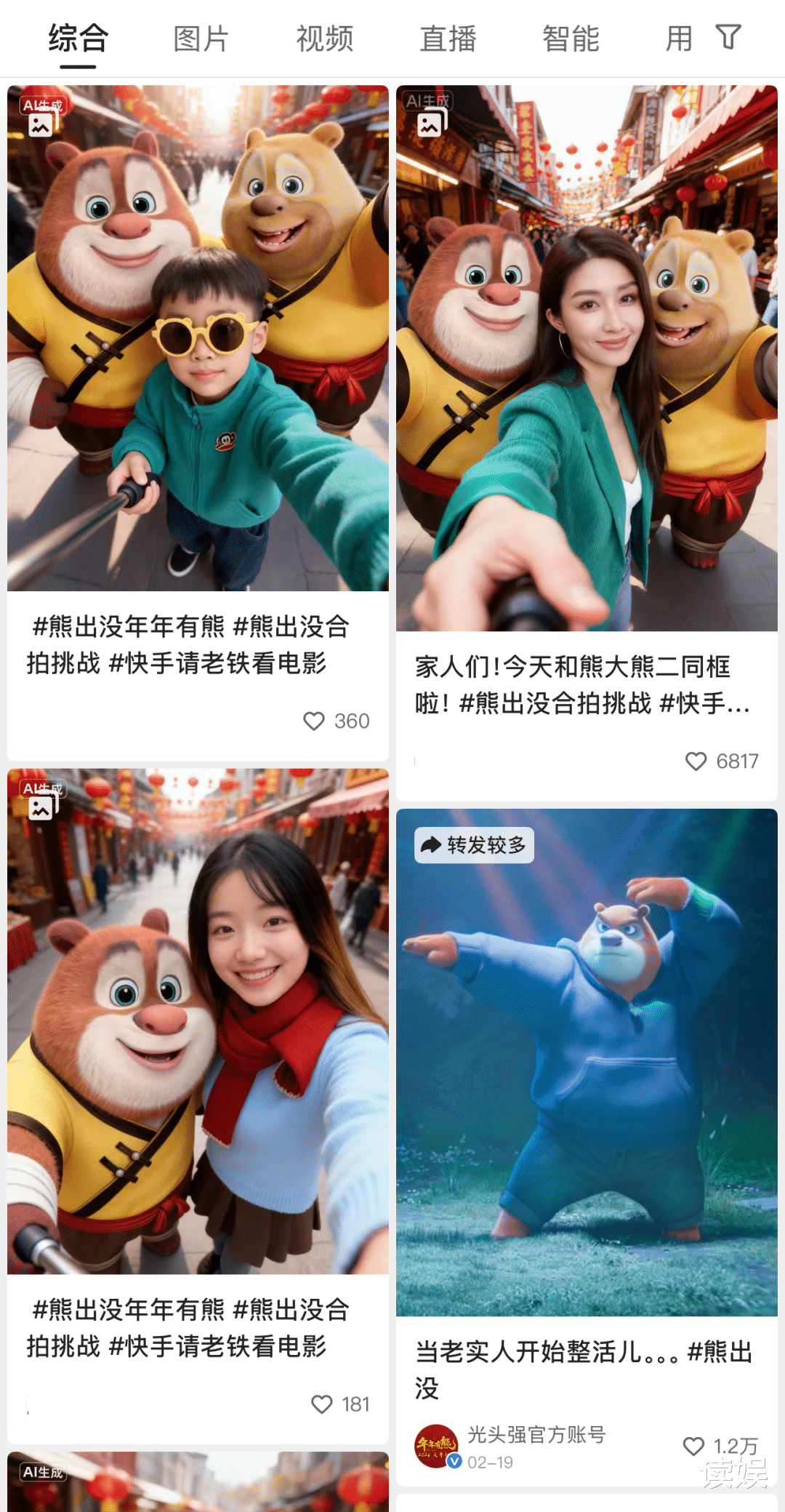 此次熊出没新春盛典中,就有大量粉丝基于可灵AI生成的素材进行二次创作,相关话题登上181个快手热榜,可灵AI魔表#熊出没合拍挑战玩法吸引了近2万人次参与,这种模式增强了粉丝的参与感和归属感,更让宣发本身成为IP体验的一部分,在大众自发传播中实现口碑与热度提升。